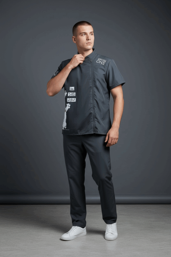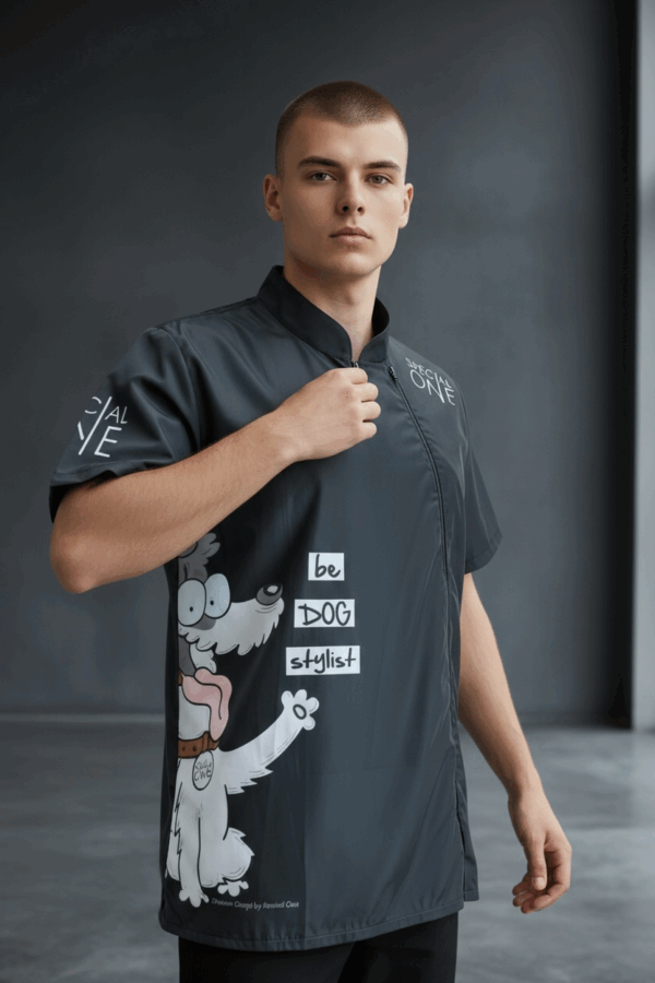 Casacca da Uomo – Modello Be Dog. La casacca Be Dog unisce professionalità e autoironia: un design quasi nero, elegante e tecnico, arricchito da un simpatico fox terrier stilizzato in stile cartoon che alleggerisce il look senza rinunciare allo stile da vero groomer. Leggera, elasticizzata e super traspirante grazie alla tecnologia Breathlock+, offre comodità assoluta durante il lavoro. La zip laterale e il taglio maschile garantiscono praticità e libertà di movimento.